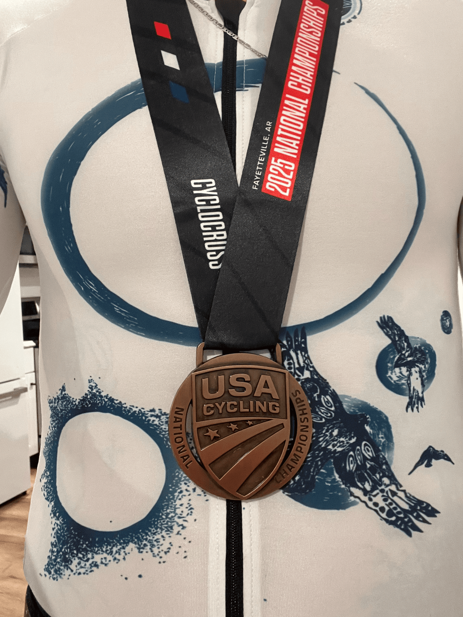 As I write this, I’m sitting in an airport in Arkansas coming off a fourth-place podium finish at the National Championships, representing Hampshire in the Collegiate Club category. Unfortunately, a flat tire ended my bid for the win, but I’m still very happy to step on the podium with a Hampshire kit [suit] that I designed myself!